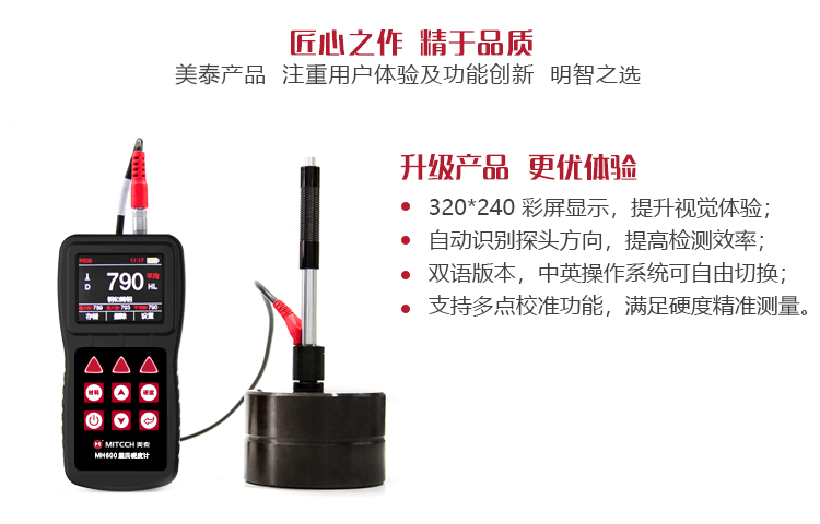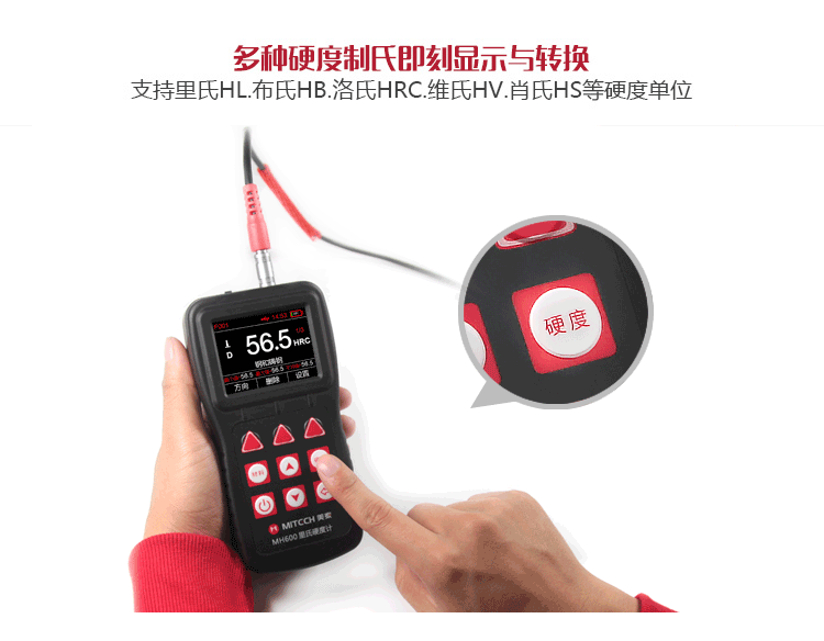 產(chǎn)品概述MH600便攜式里氏硬度計,智能化設(shè)計可方便快捷地現(xiàn)場檢測金屬硬度。IP65防護等級,可有效防御惡劣現(xiàn)場環(huán)境中的油污、粉塵及其它腐蝕;采用彩色液晶顯示屏,光線昏暗及日光強烈環(huán)境下也能為您呈現(xiàn)清晰測量結(jié)果,大大提升了視覺體驗;獨創(chuàng)的多點校準功能,可對轉(zhuǎn)換曲線進行多點調(diào)校,減小測量誤差;測量中儀器可自動識別測量方向,超出設(shè)定范圍自動報警、可語音播報測量結(jié)果,滿足高效采集多角度材料的精準檢測需求,支持多種硬度制氏間的自由轉(zhuǎn)換;低功耗設(shè)計由兩節(jié)AA五號電池供電,支持多種語言版本切換。被廣泛地應(yīng)用于金屬加工制造業(yè)、特種設(shè)備或永久性組件的在役失效分析、商檢等領(lǐng)域。特別適宜對大型不可拆卸部件的現(xiàn)場硬度測試。是提高生產(chǎn)合格率、節(jié)約成本必備的專業(yè)精密儀器。