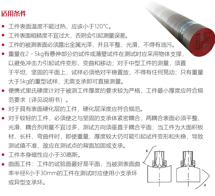 只有重大于5kg的重型試樣,無需支承即可直接測量。便攜式里氏硬度計對于被測工件 厚度的要求較為嚴格,工件最小厚度應(yīng)符合說明書規(guī)范要求。
