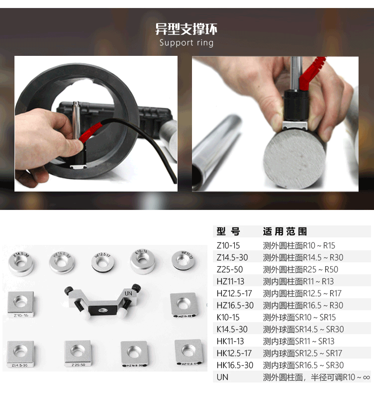 當(dāng)被測表面曲率半徑R小于30mm的工件在測試時應(yīng)使用小支承環(huán)或異型支承環(huán)。