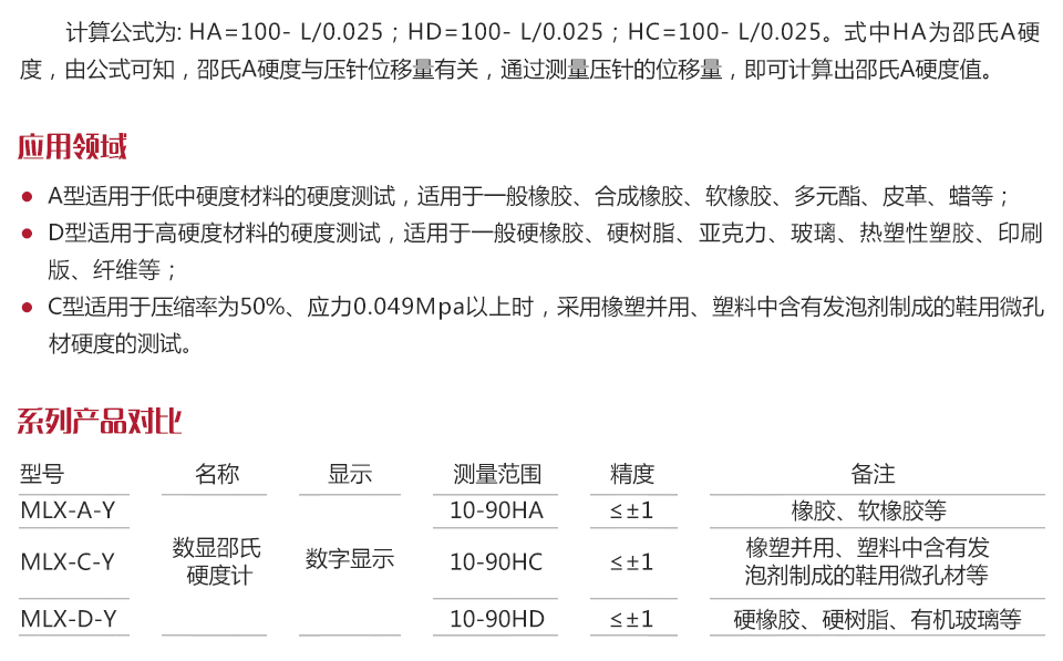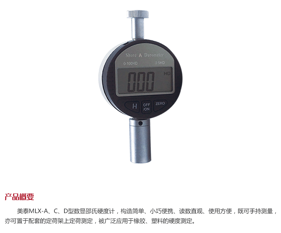 美泰MLX-A、C、D型數(shù)顯邵氏硬度計(jì),構(gòu)造簡(jiǎn)單、小巧便攜、讀數(shù)直觀、使用方便,既可手持測(cè)量,亦可置于配套的定荷架上定荷測(cè)定,被廣泛應(yīng)用于橡膠、塑料的硬度測(cè)定。