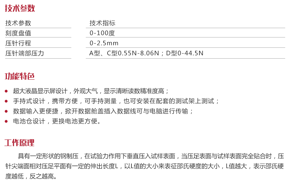 | 壓針端部壓力 | A型、C型0.55N-8.06N;D型0-44.5N |