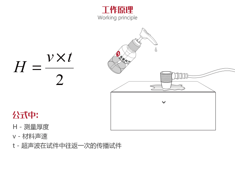 工作原理本超聲波測厚儀對厚度的測量,是由探頭產(chǎn)生超聲波脈沖透過耦合劑到達被測體,一部分超聲信號被物體底面反射,探頭接收由被測體底面反射的回波,精確地計算超聲波的往返時間,并按下式計算厚度值,再將計算結(jié)果顯示出來。