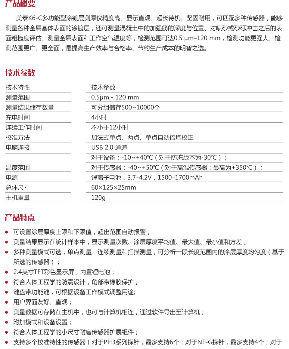 美泰K6-C多功能型涂鍍層測厚儀精度高、顯示直觀、超長待機、堅固耐用,可匹配多種傳感器,能夠測量各種金屬基體表面的涂鍍層,還可測量混凝土中的加強筋的深度與位置、對噴砂或砂礫沖擊之后的表面粗糙度評估、測量金屬表面和工作空氣溫度等,檢測范圍可達0.5 μm–120 mm,檢測功能更強大、檢測范圍更廣、更全面,是提高生產(chǎn)效率與合格率、節(jié)約生產(chǎn)成本的明智之選。