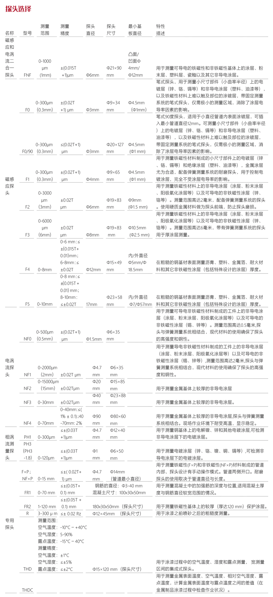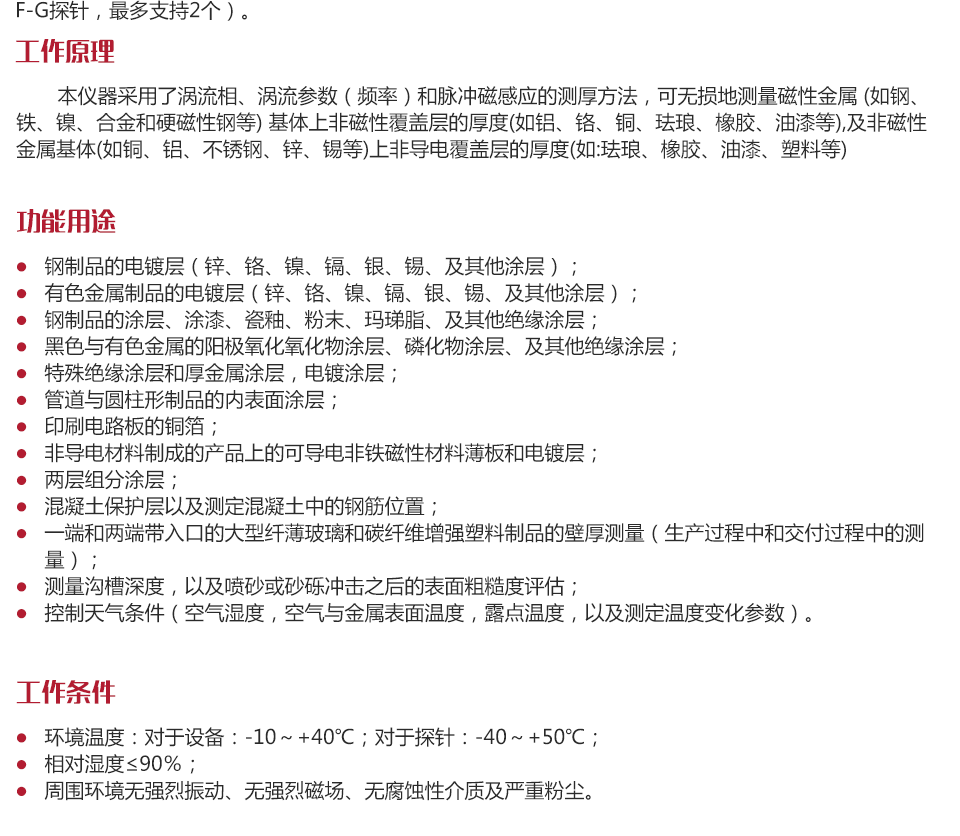 工作原理本儀器采用了渦流相、渦流參數(shù)(頻率)和脈沖磁感應的測厚方法,可無損地測量磁性金屬 (如鋼、鐵、鎳、合金和硬磁性鋼等) 基體上非磁性覆蓋層的厚度(如鋁、鉻、銅、琺瑯、橡膠、油漆等),及非磁性金屬基體(如銅、鋁、不銹鋼、鋅、錫等)上非導電覆蓋層的厚度(如:琺瑯、橡膠、油漆、塑料等)