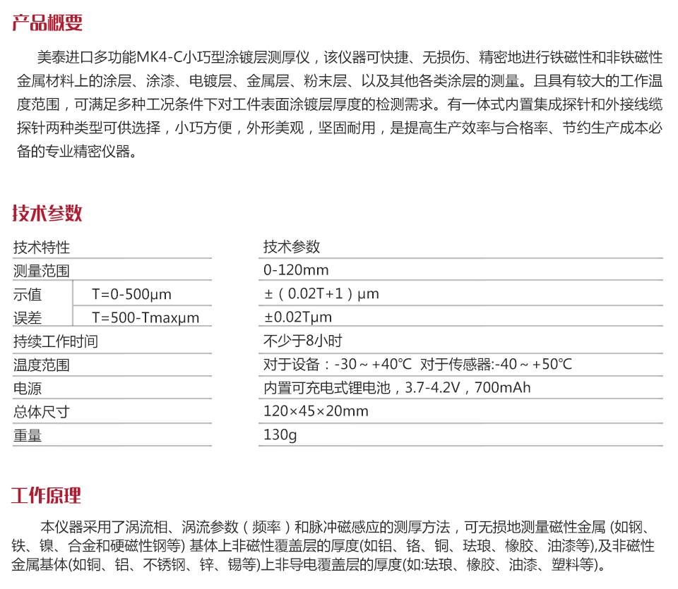 產(chǎn)品概述美泰進口多功能MK4-C小巧型涂鍍層測厚儀,該儀器可快捷、無損傷、精密地進行鐵磁性和非鐵磁性金屬材料上的涂層、涂漆、電鍍層、金屬層、粉末層、以及其他各類涂層的測量。且具有較大的工作溫度范圍,可滿足多種工況條件下對工件表面涂鍍層厚度的檢測需求。有一體式內(nèi)置集成探針和外接線纜探針兩種類型可供選擇,小巧方便,外形美觀,堅固耐用,是提高生產(chǎn)效率與合格率、節(jié)約生產(chǎn)成本必備的專業(yè)精密儀器。
