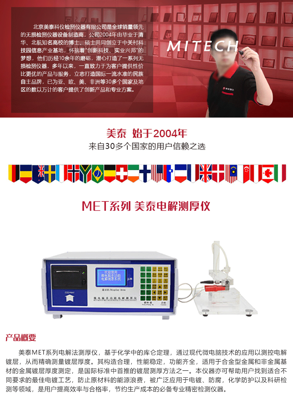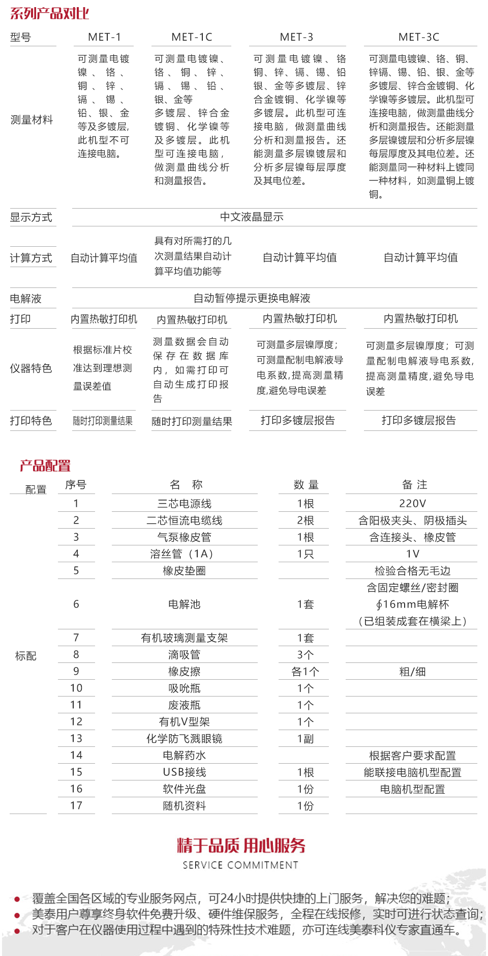 美泰MET系列電解法測厚儀,基于化學(xué)中的庫侖定理,通過現(xiàn)代微電腦技術(shù)的應(yīng)用以測控電解鍍層,從而精確測量鍍層厚度。其構(gòu)造合理,性能穩(wěn)定,功能齊全,適用于合金型金屬和非金屬基材的金屬鍍層厚度測定,是國際標(biāo)準(zhǔn)中首推的鍍層測厚方法之一。本儀器亦可幫助用戶找到適合不同要求的最佳電鍍工藝,防止原材料的能源浪費,被廣泛應(yīng)用于電鍍、防腐,化學(xué)防護(hù)以及科研檢測等領(lǐng)域,是用戶提高效率與合格率,節(jié)約生產(chǎn)成本的必備專業(yè)精密檢測儀器。