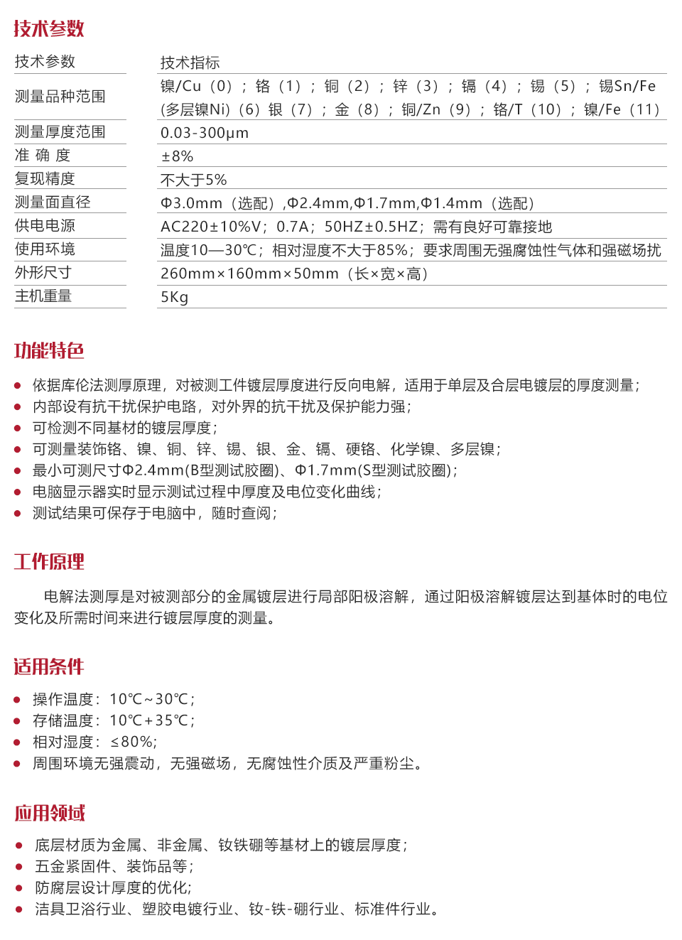 儀器特點l 依據(jù)庫倫法測厚原理,對被測工件鍍層厚度進(jìn)行反向電解,適用于單層及合層電鍍層的厚度測量;