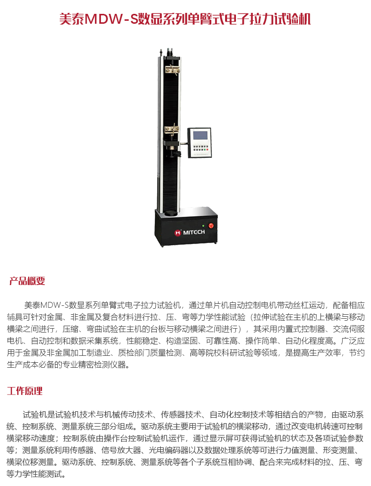 產(chǎn)品概述美泰MDW-S數(shù)顯系列單臂式電子拉力試驗機,通過單片機自動控制電機帶動絲杠運動,配備相應(yīng)輔具可針對金屬、非金屬及復(fù)合材料進行拉、壓、彎等力學性能試驗(拉伸試驗在主機的上橫梁與移動橫梁之間進行,壓縮、彎曲試驗在主機的臺板與移動橫梁之間進行),其采用內(nèi)置式控制器、交流伺服電機、自動控制和數(shù)據(jù)采集系統(tǒng),性能穩(wěn)定、構(gòu)造堅固、可靠性高、操作簡單、自動化程度高。廣泛應(yīng)用于金屬及非金屬加工制造業(yè)、質(zhì)檢部門質(zhì)量檢測、高等院??蒲性囼灥阮I(lǐng)域,是提高生產(chǎn)效率,節(jié)約生產(chǎn)成本必備的專業(yè)精密檢測儀器。