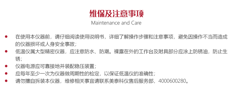 低溫儀屬大型精密儀器,應(yīng)注意防水、防潮。裸露在外的工作臺(tái)及附具部分應(yīng)涂上防銹油,防止生銹;
