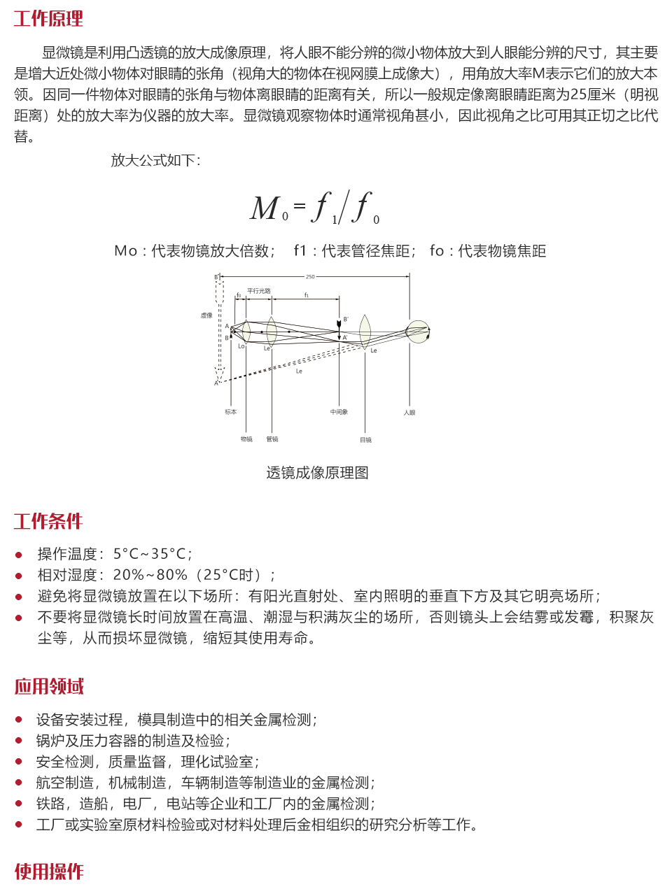 工作原理顯微鏡是利用凸透鏡的放大成像原理,將人眼不能分辨的微小物體放大到人眼能分辨的尺寸,其主要是增大近處微小物體對(duì)眼睛的張角(視角大的物體在視網(wǎng)膜上成像大),用角放大率M表示它們的放大本領(lǐng)。因同一件物體對(duì)眼睛的張角與物體離眼睛的距離有關(guān),所以一般規(guī)定像離眼睛距離為25厘米(明視距離)處的放大率為儀器的放大率。顯微鏡觀察物體時(shí)通常視角甚小,因此視角之比可用其正切之比代替。