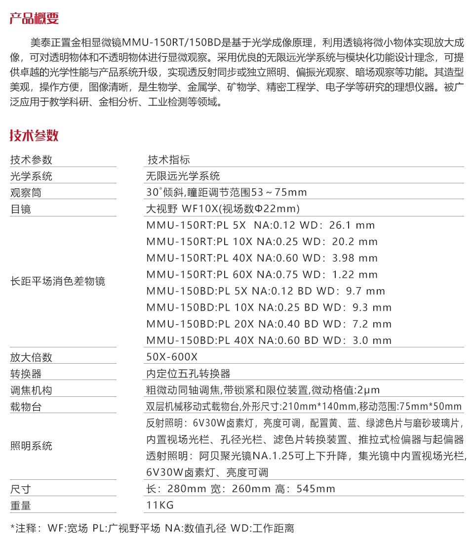 | 無(wú)限遠(yuǎn)平場(chǎng)消色差物鏡:MMU-150BD | PL 5X NA:0.12 BD WD:9.7 mm/PL 10X NA:0.25 BD WD:9.3 mm/PL 20X NA:0.40 BD WD:7.2 mm/PL 40X NA:0.60 BD |