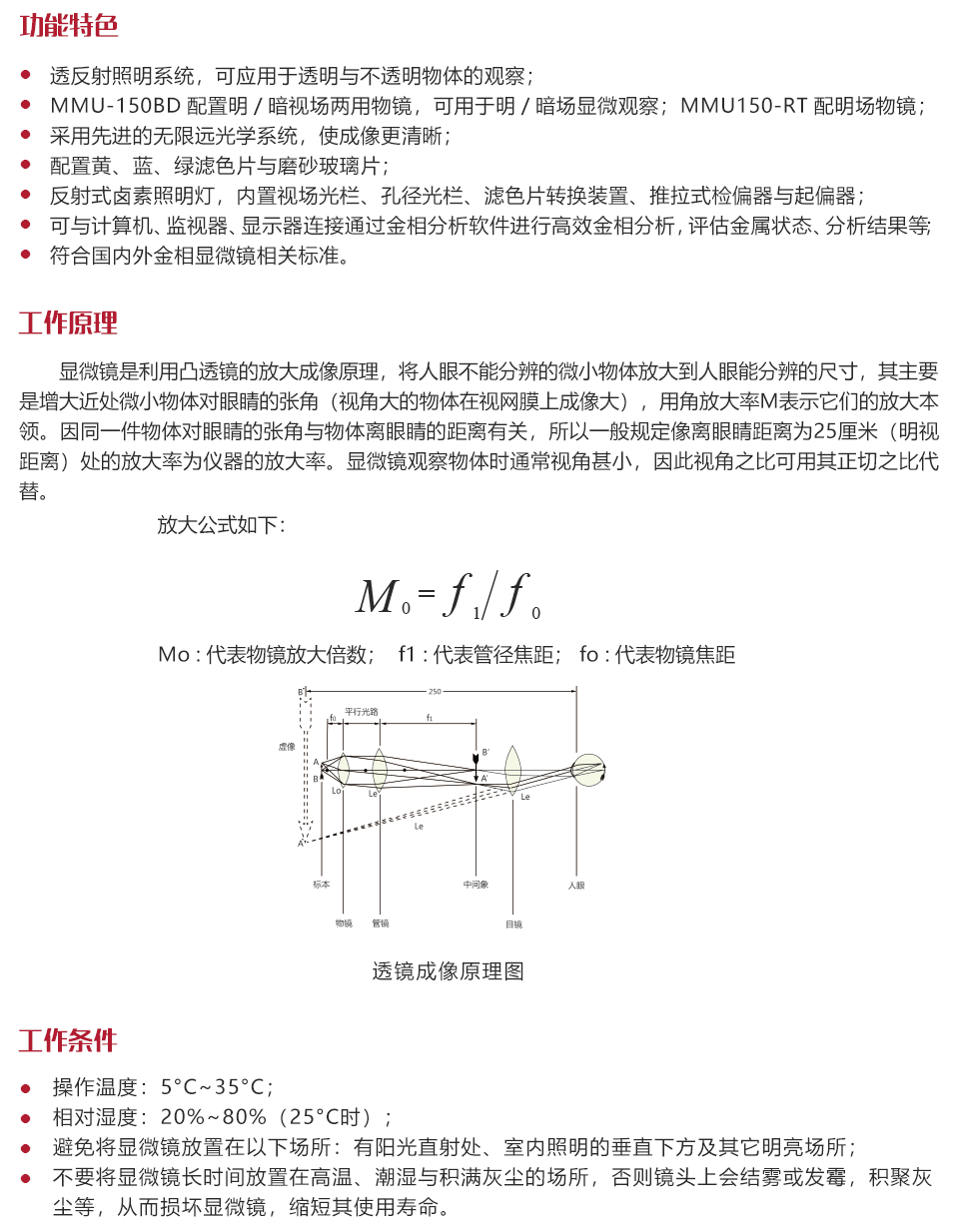 產(chǎn)品概述美泰正置金相顯微鏡MMU-150RT/150BD是基于光學(xué)成像原理,利用透鏡將微小物體實(shí)現(xiàn)放大成像,可對(duì)透明物體和不透明物體進(jìn)行顯微觀察。采用優(yōu)良的無(wú)限遠(yuǎn)光學(xué)系統(tǒng)與模塊化功能設(shè)計(jì)理念,可提供卓越的光學(xué)性能與產(chǎn)品系統(tǒng)升級(jí),實(shí)現(xiàn)透反射同步或獨(dú)立照明、偏振光觀察、暗場(chǎng)觀察等功能。其造型美觀,操作方便,圖像清晰,是生物學(xué)、金屬學(xué)、礦物學(xué)、精密工程學(xué)、電子學(xué)等研究的理想儀器。被廣泛應(yīng)用于教學(xué)科研、金相分析、工業(yè)檢測(cè)等領(lǐng)域。