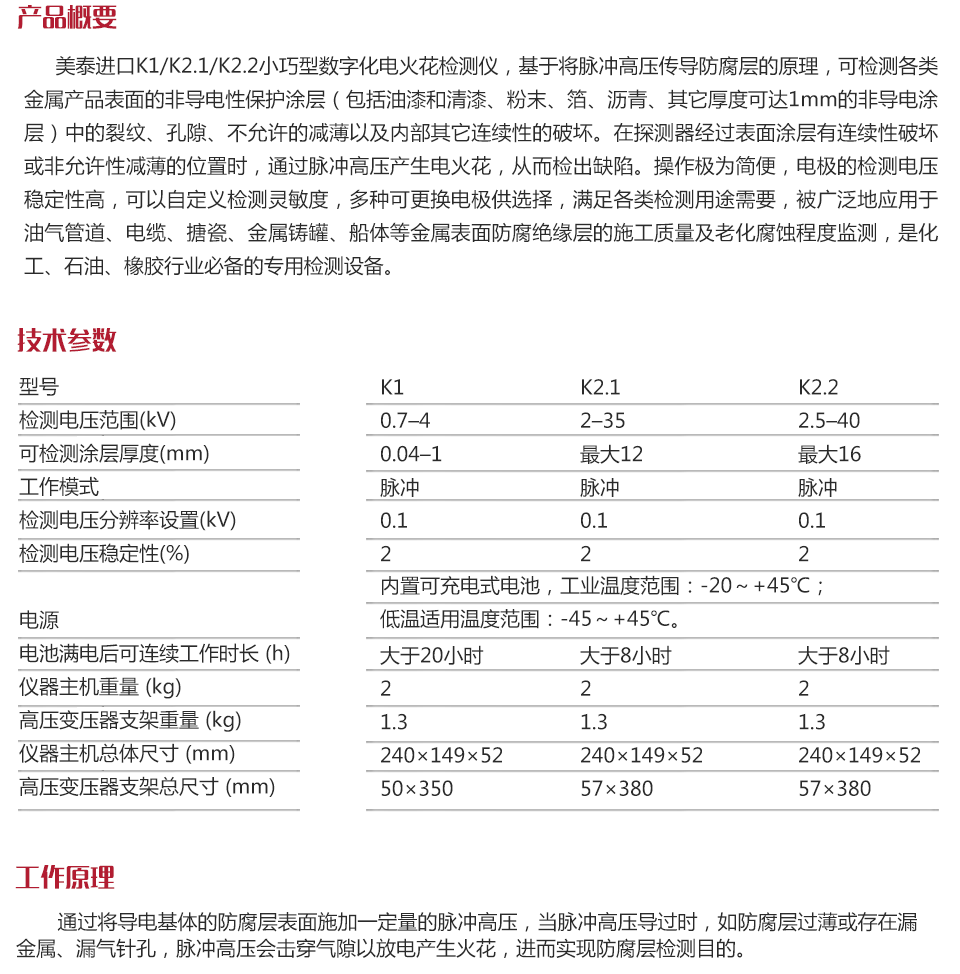 產(chǎn)品概述美泰進(jìn)口K1/K2.1/K2.2小巧型數(shù)字化電火花檢測儀,基于將脈沖高壓傳導(dǎo)防腐層的原理,可檢測各類金屬產(chǎn)品表面的非導(dǎo)電性保護(hù)涂層(包括油漆和清漆、粉末、箔、瀝青、其它厚度可達(dá)1mm的非導(dǎo)電涂層)中的裂紋、孔隙、不允許的減薄以及內(nèi)部其它連續(xù)性的破壞。在探測器經(jīng)過表面涂層有連續(xù)性破壞或非允許性減薄的位置時(shí),通過脈沖高壓產(chǎn)生電火花,從而檢出缺陷。操作極為簡便,電極的檢測電壓穩(wěn)定性高,可以自定義檢測靈敏度,多種可更換電極供選擇,滿足各類檢測用途需要,被廣泛地應(yīng)用于油氣管道、電纜、搪瓷、金屬鑄罐、船體等金屬表面防腐絕緣層的施工質(zhì)量及老化腐蝕程度監(jiān)測,是化工、石油、橡膠行業(yè)必備的專用檢測設(shè)備。
