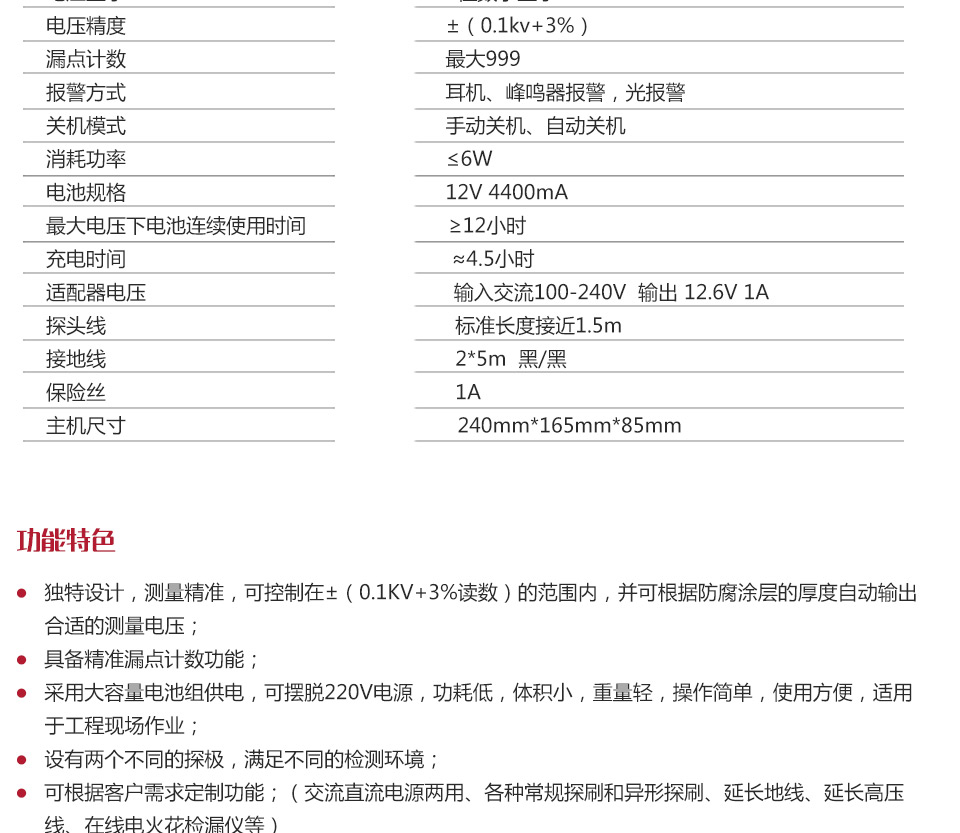 功能用途?適用于不同厚度的搪玻璃、玻璃鋼、環(huán)氧煤瀝青和橡膠襯里等涂層的質(zhì)量檢測(cè)。