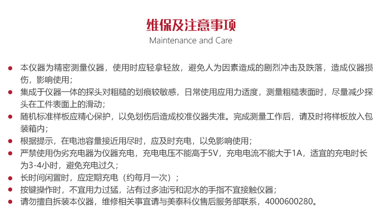 儀器的保養(yǎng)與維護(hù)美泰便攜式粗糙度儀MR100屬精密檢測(cè)儀器,使用中應(yīng)特別注意如下事項(xiàng):