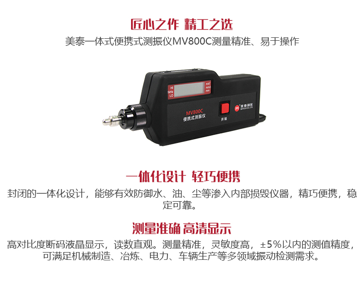 產(chǎn)品概述美泰袖珍一體化測振儀MV800C系列是由壓電式傳感器和數(shù)字顯示電路組成的手持式測振儀表,主要用于測量各種旋轉(zhuǎn)機(jī)械的振動(dòng)加速度、速度和位移。MV800C系列分兩種型號(hào)MV800C-5(頻響范圍:5Hz~10KHz)和MV800C-10(頻響范圍:10Hz~10KH),可滿足常規(guī)測振使用需求以及低頻振動(dòng)測量需求。該產(chǎn)品測量范圍廣,顯示直觀、一體化的設(shè)計(jì)體積小、重量輕,測量攜帶方便,特別適用于野外無電源的現(xiàn)場作業(yè)及高空作業(yè),大大減少工作人員的工作強(qiáng)度,提高工作效率。
