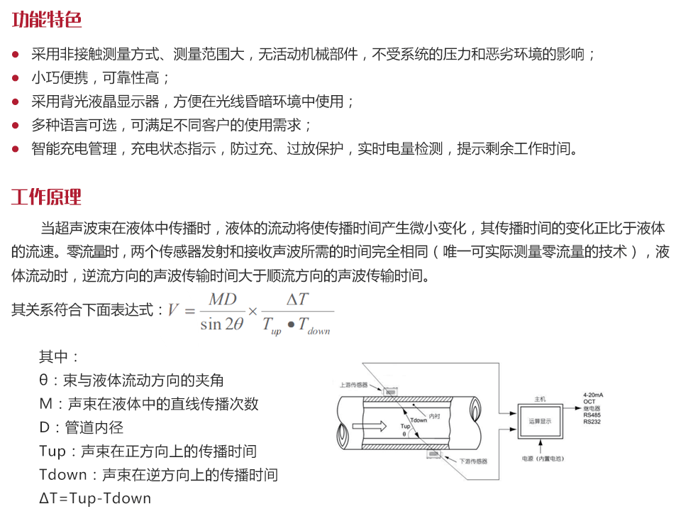 工作原理當(dāng)超聲波束在液體中傳播時,液體的流動將使傳播時間產(chǎn)生微小變化,其傳播時間的變化正比于液體的流速。零流量時,兩個傳感器發(fā)射和接收聲波所需的時間完全相同(唯一可實際測量零流量的技術(shù)),液體流動時,逆流方向的聲波傳輸時間大于順流方向的聲波傳輸時間。