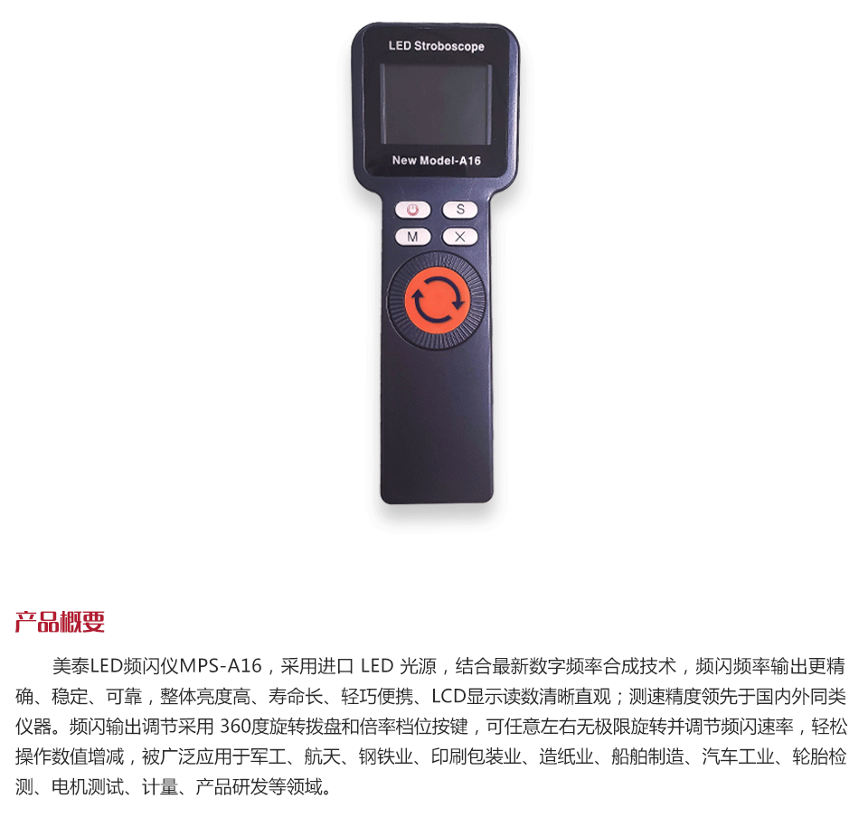 美泰LED頻閃儀MPS-A16,采用進(jìn)口 LED 光源,結(jié)合最新數(shù)字頻率合成技術(shù),頻閃頻率輸出更精確、穩(wěn)定、可靠,整體亮度高、壽命長(zhǎng)、輕巧便攜、LCD顯示讀數(shù)清晰直觀;測(cè)速精度領(lǐng)先于國(guó)內(nèi)外同類儀器。頻閃輸出調(diào)節(jié)采用 360 度旋轉(zhuǎn)撥盤和倍率檔位按鍵,可任意左右無(wú)極限旋轉(zhuǎn)并調(diào)節(jié)頻閃速率,輕松操作數(shù)值增減,被廣泛應(yīng)用于軍工、航天、鋼鐵業(yè)、印刷包裝業(yè)、造紙業(yè)、船舶制造、汽車工業(yè)、輪胎檢測(cè)、電機(jī)測(cè)試、計(jì)量、產(chǎn)品研發(fā)等領(lǐng)域。