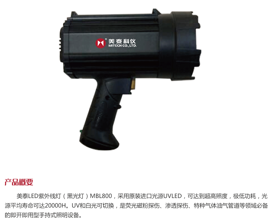 美泰LED紫外線燈(黑光燈)MBL800,采用原裝進(jìn)口光源UVLED,可達(dá)到超高照度,極低功耗,光源平均壽命可達(dá)20000H。UV和白光可切換,是熒光磁粉探傷、滲透探傷、特種氣體、油氣管道等領(lǐng)域必備的即開即用型手持式照明設(shè)備。