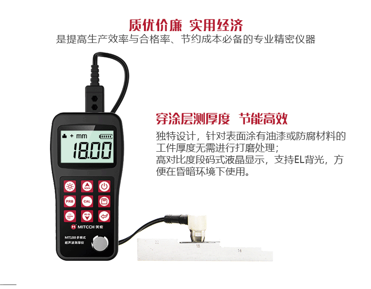 產(chǎn)品概述美泰MT180 超聲波測(cè)厚儀,基于超聲波測(cè)量原理,可對(duì)金屬、塑料、陶瓷、玻璃及其他多種超聲波的良導(dǎo)體材料進(jìn)行厚度測(cè)量,也可實(shí)現(xiàn)對(duì)材料聲速的反測(cè)。與傳統(tǒng)的測(cè)量方法相比,超聲波測(cè)厚儀的優(yōu)勢(shì)在于它只要接觸到被測(cè)工件的一面即可完成測(cè)量,其獨(dú)特的可穿透涂層測(cè)厚度的性能為表面涂有油漆或防腐材料的工件厚度檢測(cè)提供了更加高效的解決方案,測(cè)量前無(wú)需處理掉表面的涂層,直接亦可測(cè)量。被廣泛應(yīng)用于石油、化工、冶金、造船、航空、航天等領(lǐng)域的生產(chǎn)設(shè)備中各種管道及壓力容器腐蝕減薄程度的監(jiān)測(cè),也可用于對(duì)各種板材及各種加工零件做精確的測(cè)量。是提高生產(chǎn)效率與合格率、節(jié)約成本必備的專業(yè)精密儀器。