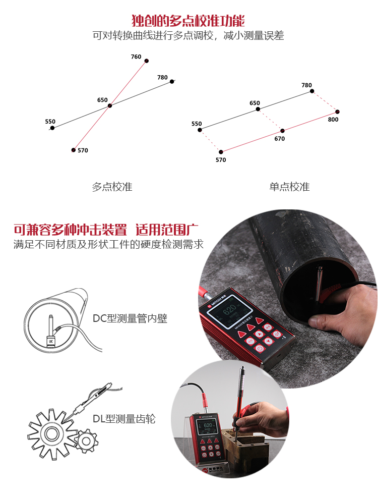 產品概述MH660便攜式里氏硬度計是美泰公司新推出的升級產品,它更加注重用戶體驗及功能創(chuàng)新。采用320×240彩色液晶顯示屏,光線昏暗及日光強烈環(huán)境下也能為您呈現清晰測量結果,大大提升了視覺體驗;密封的金屬外殼精巧設計,體積更小、品質更優(yōu),專為抵御惡劣現場環(huán)境中的油污、粉塵而設計;獨創(chuàng)的多點校準功能,可對轉換曲線進行多點調校,減小測量誤差;測量中儀器可自動識別測量方向,滿足高效采集多角度材料硬度的精準檢測需求,支持多種硬度制氏間的自由轉換;低功耗設計由兩節(jié)AA五號電池供電,可實現藍牙通訊,支持多語言版本切換。被廣泛地應用于金屬加工制造業(yè)、特種設備或永久性組件的在役失效分析、商檢等領域。特別適宜對大型不可拆卸部件的現場硬度測試。是提高生產合格率、節(jié)約成本必備的專業(yè)精密儀器。