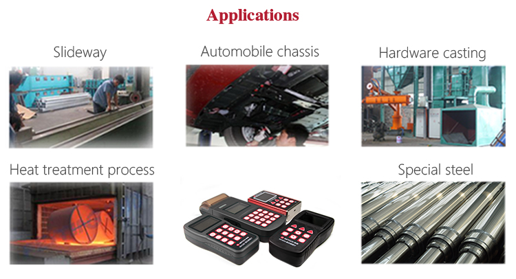 Main applications:car chassis hardness testing;the installed machinery and permanently assembled parts;rapid testing in large range and multi-measuring areas for large-scale work piece;failure analysis of pressure vessel, steam generator and other equipment;bearings and other parts;material identification in the warehouse of metallic materials;heat treatment workpiece of quality control;