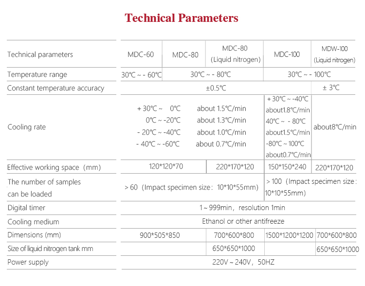 Mitech MDC Series Impact test low temperature meter,adopt imported compressor refrigeration technology, heat balance principle and the way of mixing, can achieve the sample of automatic uniform cooling, constant temperature storage, its strong structure, simple structure, easy operation, high efficiency, low temperature impact test material is the best test Like cooling, insulation equipment, but also for other low temperature testing and testing work.