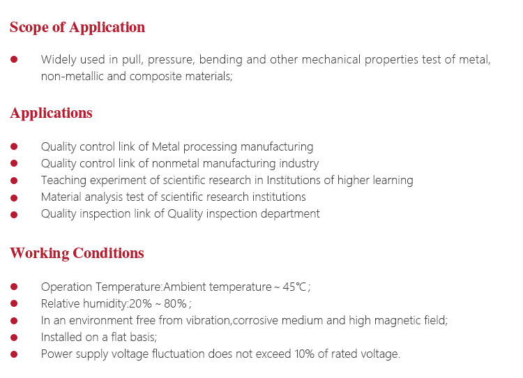Working PrincipleThe testing machine is the product of combing the testing machine technology with the mechanical transmission technology, the sensor technology, the automation control technology and so on, which is composed of the drive system, the control system, the measurement system . The driving system is mainly used for the movement of the beam of the testing machine through the control valve. The control system regulate the testing machine by the console , getting the state of the test machine and the test parameters through the display screen. The measuring system can conduct the measurement of force , deformation and beam displacement using the sensor, signal amplifiers, photoelectric encoders and data processing systems. This machine can conduct the mechanical performance testing of the material pull, pressure, bending and so on through the coordination of the drive system, control system, measurement system and other subsystems
