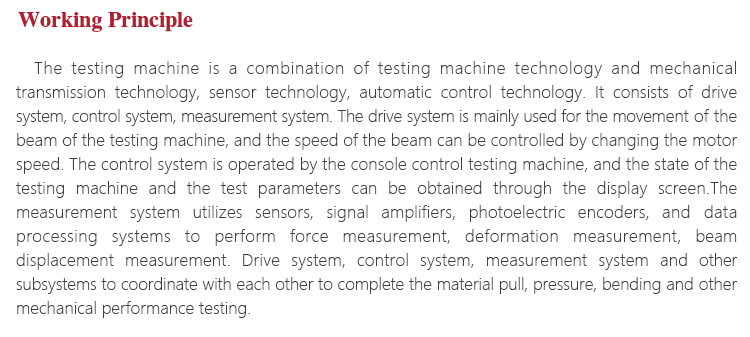 Working PrincipleThe testing machine is a combination of testing machine technology and mechanical transmission technology, sensor technology, automatic control technology. It consists of drive system, control system, measurement system. The drive system is mainly used for the movement of the beam of the testing machine, and the speed of the beam can be controlled by changing the motor speed. The control system is operated by the console control testing machine, and the state of the testing machine and the test parameters can be obtained through the display screen.The measurement system utilizes sensors, signal amplifiers, photoelectric encoders, and data processing systems to perform force measurement, deformation measurement, beam displacement measurement. Drive system, control system, measurement system and other subsystems to coordinate with each other to complete the material pull, pressure, bending and other mechanical performance testing.