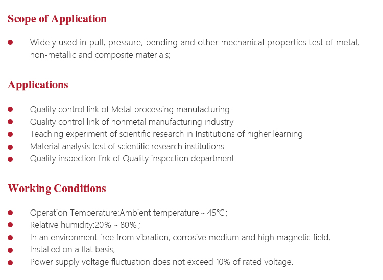 <!--[if !supportLists]-->       l <!--[endif]-->Test machine is a large precision instruments, should pay attention to water, moisture. Exposed workstations, upper and lower beam parts and attached parts should be coated with anti-rust oil to prevent rust;