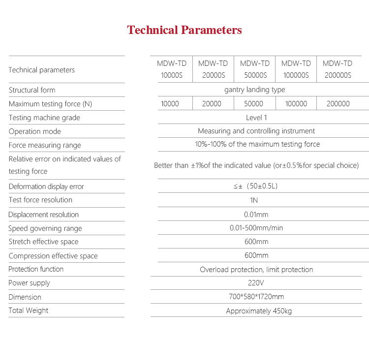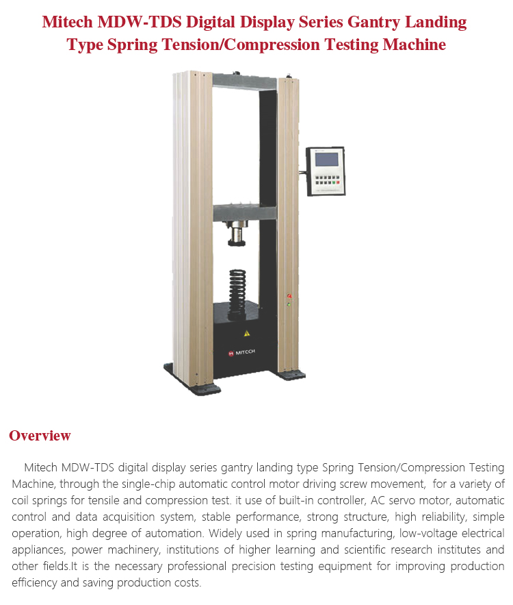 Product OverviewMitech MDW-S digital display series gantry landing type Spring Tension/Compression Testing Machine, through the single-chip automatic control motor driving screw movement, for a variety of coil springs for tensile and compression test. it use of built-in controller, AC servo motor, automatic control and data acquisition system, stable performance, strong structure, high reliability, simple operation, high degree of automation. Widely used in spring manufacturing, low-voltage electrical appliances, power machinery, institutions of higher learning and scientific research institutes and other fields.It is the necessary professional precision testing equipment for improving production efficiency and saving production costs.