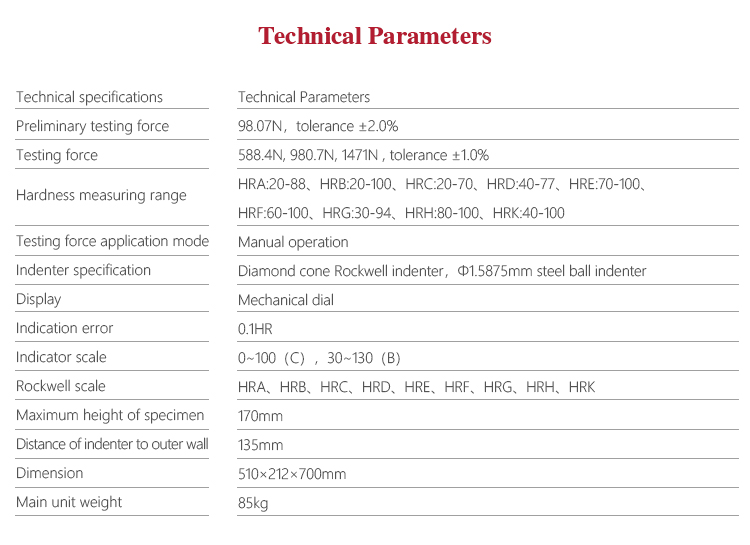 | Hardness Measuring range | HRA:20-88、HRB:20-100、HRC:20-70、HRD:40-77、HRE:70-100、 HRF:60-100、HRG:30-94、HRH:80-100、HRK:40-100 |