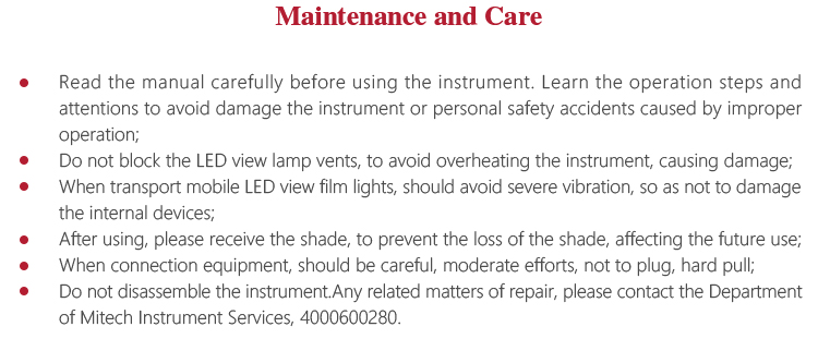 Product OverviewMitech MG100 portable LED view film lights,can check the X-ray film one by one.With high-power LED light source, surface observation screen acrylic material, stable performance, strong structure, high uniformity, simple operation, user-friendly LED limit temperature, stepless dimming, can meet the needs better,which is widely used in X Ray detection for film observation and evaluation.It is the necessary professional precision testing equipment for improving production efficiency and saving production costs
