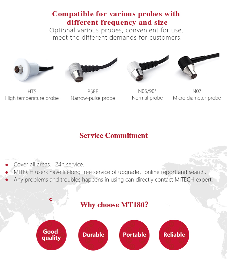 Product OverviewMiteh MT180 multi-mode ultrasonic thickness gauge, based on ultrasonic measuring principle, it can perform thickness measurements on a wide range of materials including metals, plastic, ceramics glass and other ultrasonic well-conductive materials. It is also capable for measuring the sound velocity of the object with known thickness. Compared with the traditional measurement method, the advantage of ultrasonic thickness gauge is that it can finish the measurement only if it contacts with one side of the measured workpiece. Its unique performance of capable for testing thickness through the coating provides efficient solution for testing the workpiece of coated surface or corrosion materials. It can test the workpiece directly without needing to get rid of the surface coating. It’s widely used for monitoring the production equipments’ various pipelines and pressure vessel corrosion reducing degree in the fields of petroleum, chemical, metallurgy, shipbuilding, aviation, aerospace and so on. It also can be used for making accurate measurement to various plates and machining parts. It is the necessary professional precision instrument for improving the production efficiency and qualification rate as well as saving cost.