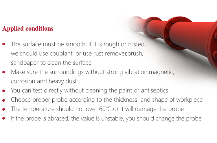 Instrument MaintenanceWhen the thickness gauge appears some other abnormal phenomena, please do not dismantle or adjust any fixedly assembled parts. Fill in and present the warranty card to us. The warranty service can be carried on. Keep it away from vibration, strong magnetic field, corrosive medium, dumpiness and dust. Storage in ordinary temperature. With Original packing, transport is allowed on the third grade highway.