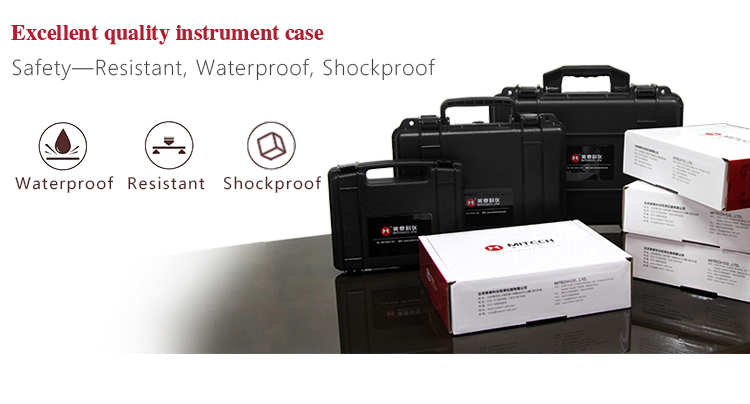 The instrument case of Mitech ultrasonic thickness gauge, length: 27cm, width: 22.5cm, height: 7.5cm and weight: 0.698kg, designed with ABS engineering plastic, It has excellent performance like waterproof, shockproof, excellent heat resistance and low temperature resistance. It can effectively prevent oil, dust and corrosion in harsh environment. Its size in line with the standards for aviation and train carrying (capable of putting under the seat and on the luggage rack), it is safe, reliable and stable.