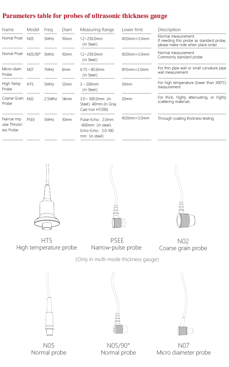 | Probe Diameter | Standard Probe P5EE is 10mm, Probe N05 is10MM、Probe N07 is 6MM、Probe HT5 is12MM、Probe N02 is12MM |