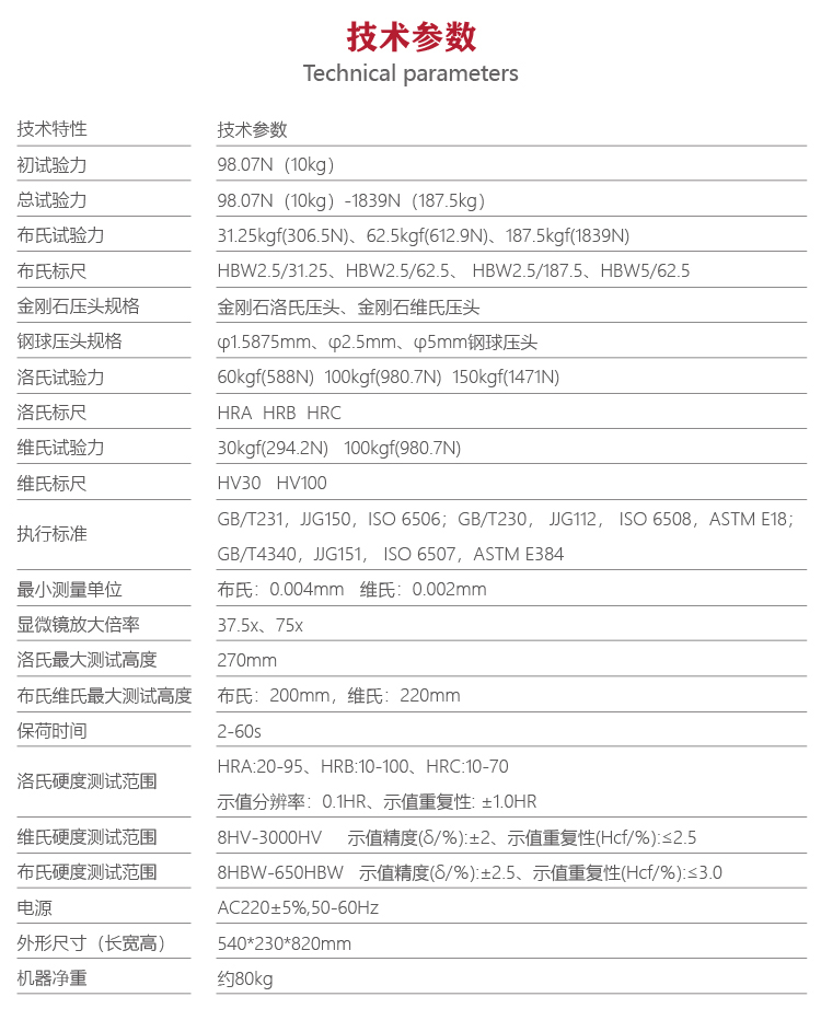 | 布氏硬度測(cè)試范圍 | 8HBW-650HBW 示值精度(δ/%):±2.5、示值重復(fù)性(Hcf/%):≤3.0 |