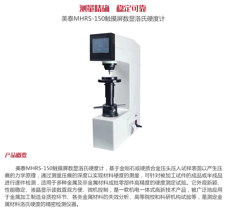 產(chǎn)品概述美泰MHRS-150觸摸屏數(shù)顯洛氏硬度計(jì),基于金剛石或硬質(zhì)合金壓頭壓入試樣表面以產(chǎn)生壓痕的力學(xué)原理,通過(guò)測(cè)量壓痕的深度以實(shí)現(xiàn)材料硬度的測(cè)量,可針對(duì)被加工試件的成品或半成品進(jìn)行逐件檢測(cè),適用于多種金屬及非金屬材料成批零部件高精度的硬度測(cè)定試驗(yàn)。它外觀新穎、性能穩(wěn)定、液晶顯示讀數(shù)直觀方便、微機(jī)控制,是一款機(jī)電一體式高新技術(shù)產(chǎn)品,被廣泛地應(yīng)用于金屬加工制造業(yè)質(zhì)控環(huán)節(jié)、各類金屬材料的失效分析、高等院校和科研機(jī)構(gòu)試驗(yàn)等,是測(cè)定金屬材料洛氏硬度的精密檢測(cè)儀器。