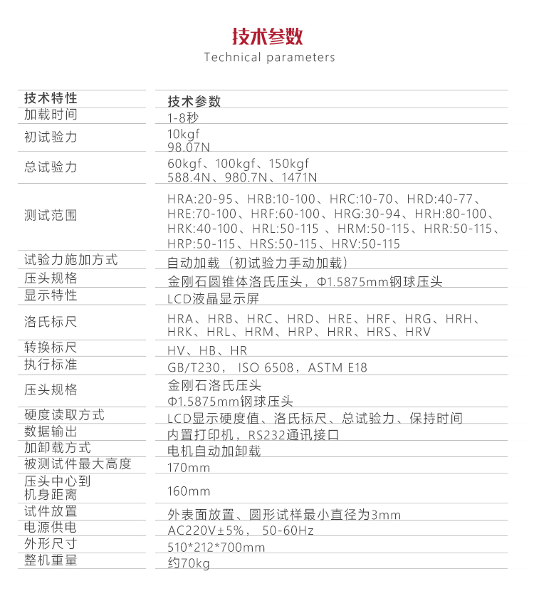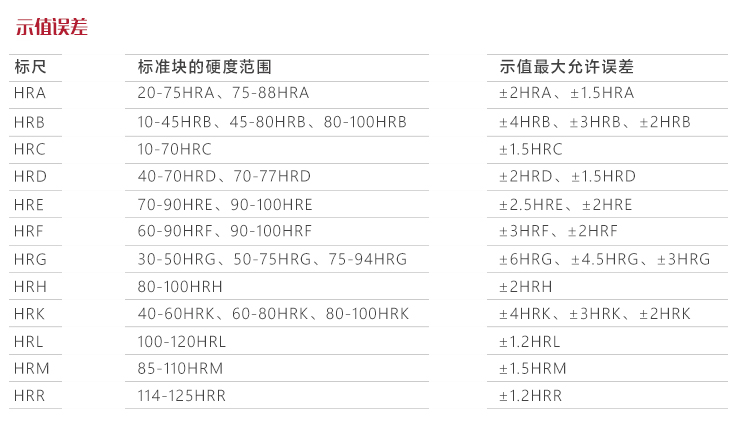 | 測(cè)試范圍 | HRA:20-95、HRB:10-100、HRC:10-70、HRD:40-77、HRE:70-100、HRF:60-100、HRG:30-94、HRH:80-100、HRK:40-100、HRL:5 |