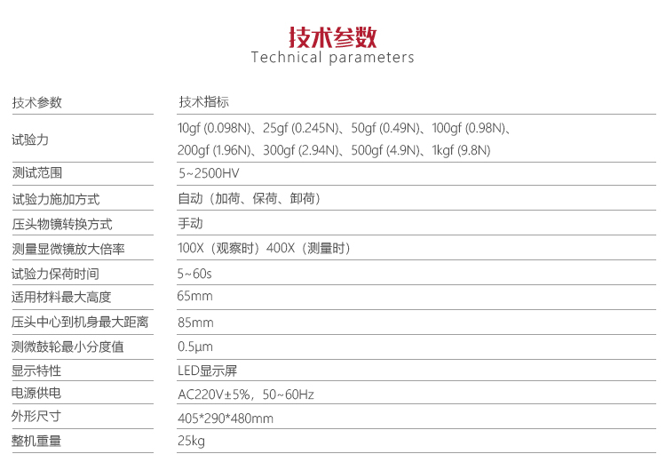 | 試驗力 | 10gf (0.098N)、25gf (0.245N)、50gf (0.49N)、100gf (0.98N)、 200gf (1.96N)、300gf (2.94N)、500gf (4.9N)、1kg |