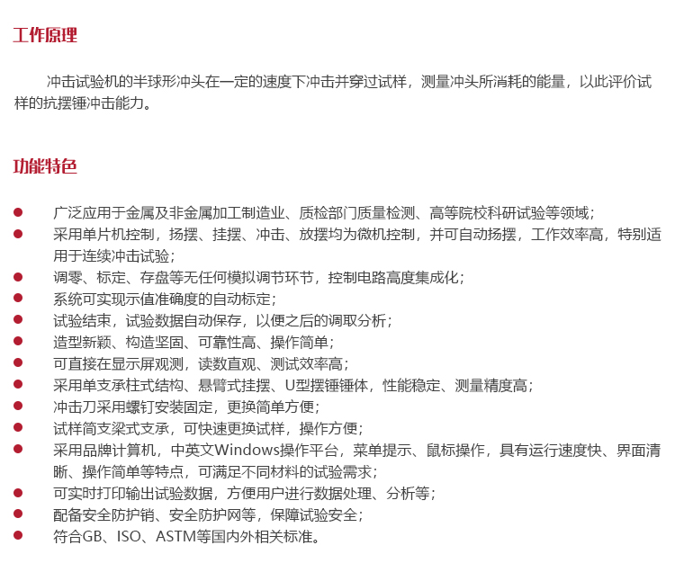 采用單片機控制,揚擺、掛擺、沖擊、放擺均為微機控制,并可自動揚擺,工作效率高,特別適用于連續(xù)沖擊試驗;