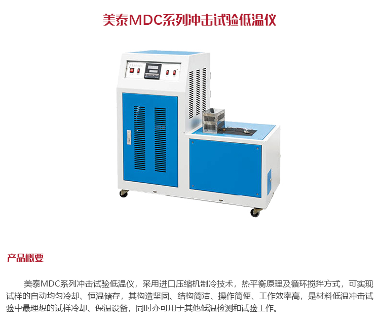 美泰MDC系列沖擊試驗(yàn)低溫儀,采用進(jìn)口壓縮機(jī)制冷技術(shù),熱平衡原理及循環(huán)攪拌方式,可實(shí)現(xiàn)試樣的自動(dòng)均勻冷卻、恒溫儲(chǔ)存,其構(gòu)造堅(jiān)固、結(jié)構(gòu)簡潔、操作簡便、工作效率高,是材料低溫沖擊試驗(yàn)中最理想的試樣冷卻、保溫設(shè)備,同時(shí)亦可用于其他低溫檢測和試驗(yàn)工作。