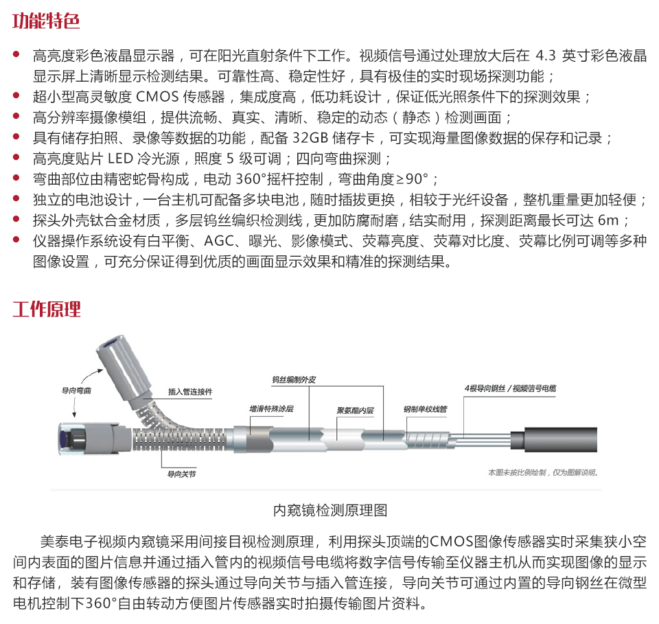 工作原理美泰電子視頻內窺鏡采用間接目視檢測原理,利用探頭頂端的CMOS圖像傳感器實時采集狹小空間內表面的圖片信息并通過插入管內的視頻信號電纜將數字信號傳輸至儀器主機從而實現圖像的顯示和存儲,裝有圖像傳感器的探頭通過導向關節(jié)與插入管連接,導向關節(jié)可通過內置的導向鋼絲在微型電機控制下360°自由轉動方便圖片傳感器實時拍攝傳輸圖片資料。