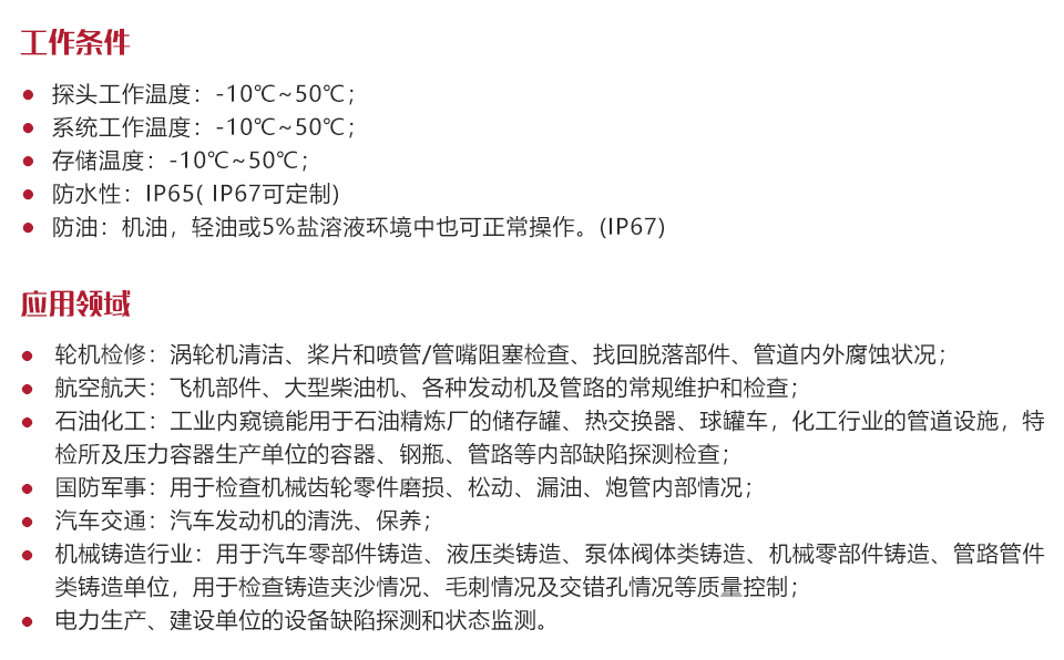 適用于狹小空間的視頻檢測,可針對狹小空間、管路,發(fā)動機,零部件、液壓、氣動件,鑄件內部進行檢測。 |