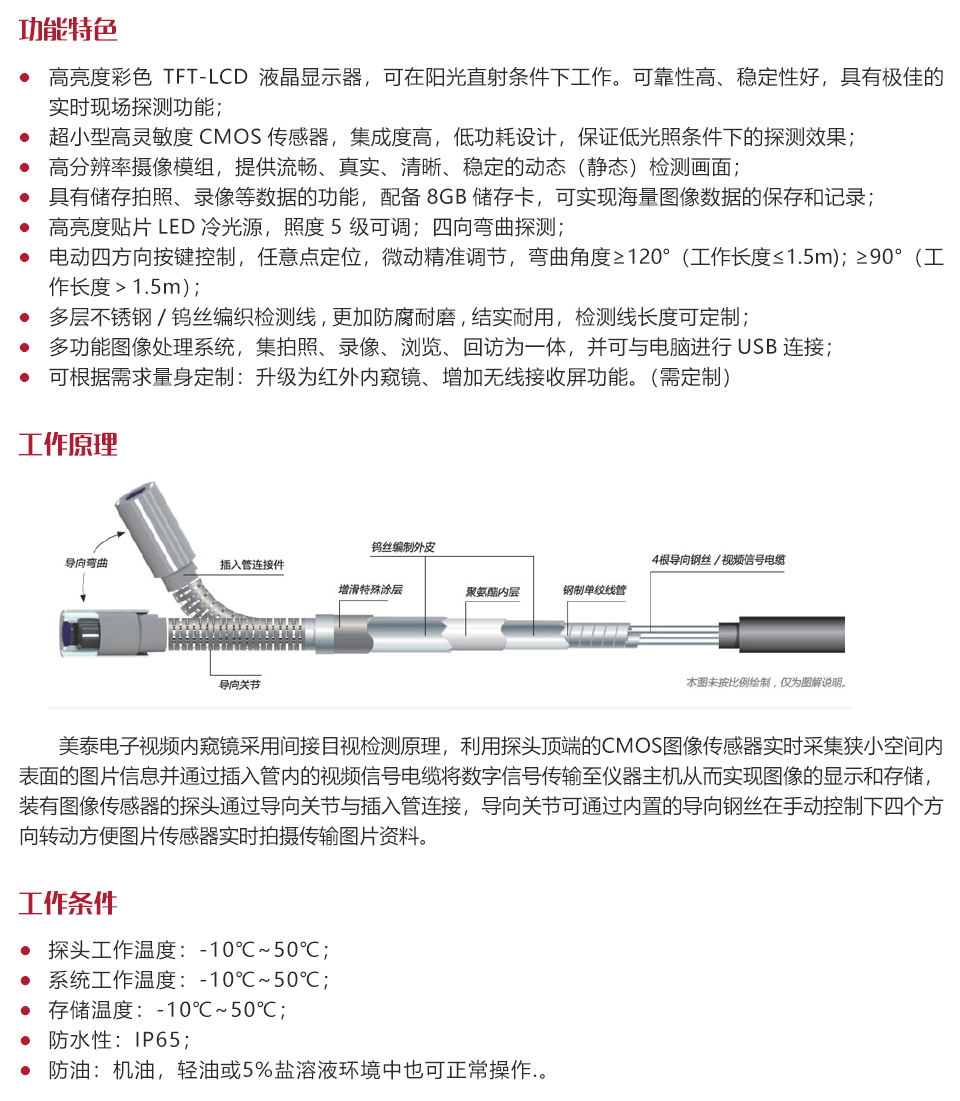 工作原理美泰電子視頻內(nèi)窺鏡采用間接目視檢測原理,利用探頭頂端的CMOS圖像傳感器實(shí)時采集狹小空間內(nèi)表面的圖片信息并通過插入管內(nèi)的視頻信號電纜將數(shù)字信號傳輸至儀器主機(jī)從而實(shí)現(xiàn)圖像的顯示和存儲,裝有圖像傳感器的探頭通過導(dǎo)向關(guān)節(jié)與插入管連接,導(dǎo)向關(guān)節(jié)可通過內(nèi)置的導(dǎo)向鋼絲在微型電機(jī)控制下四個方向轉(zhuǎn)動方便圖片傳感器實(shí)時拍攝傳輸圖片資料。