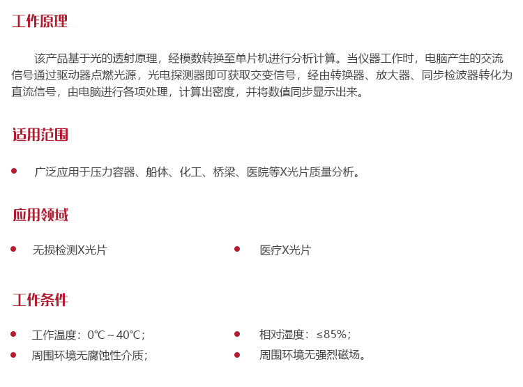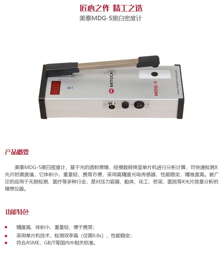 產(chǎn)品概述美泰MDG-5黑白密度計(jì),基于光的透射原理,經(jīng)模數(shù)轉(zhuǎn)換至單片機(jī)進(jìn)行分析計(jì)算,可快速檢測(cè)X光片的黑度值,它體積小、重量輕、攜帶方便,采用高精度光電傳感器,性能穩(wěn)定,精準(zhǔn)度高。被廣泛的應(yīng)用于無(wú)損檢測(cè)、醫(yī)療等多種行業(yè),是對(duì)壓力容器、船體、化工、橋梁、醫(yī)院等X光片質(zhì)量分析的理想儀器。