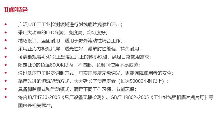 功能用途廣泛應(yīng)用于工業(yè)檢測(cè)領(lǐng)域的射線底片觀察及評(píng)定。