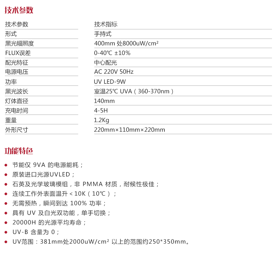 | 黑光幅照度 | 400mm 處8000uW/cm2 |