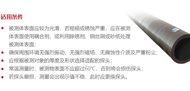 厚度測(cè)量將耦合劑均勻涂于被測(cè)區(qū)域,將探頭與被測(cè)材料表面緊密耦合,屏幕將顯示被測(cè)區(qū)域的測(cè)量厚度。當(dāng)探頭與被測(cè)材料良好耦合時(shí),屏幕將顯示耦合標(biāo)志,如果耦合標(biāo)志閃爍或無(wú)耦合標(biāo)志則表示耦合狀況不好。移開探頭后,耦合標(biāo)志消失,厚度值保持。測(cè)量中注意事項(xiàng)